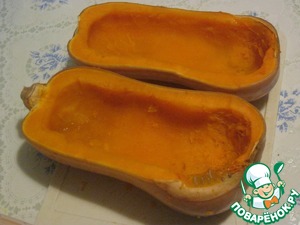 Тыкву помыть, разрезать вдоль, убрать семена, смазать маслом и запечь минут 40-45.