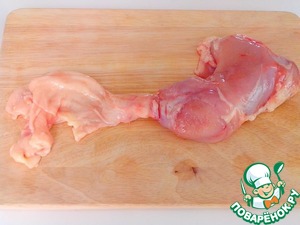 Куриные окорочка вымыть и обсушить. При помощи маленького ножа отделить кожу от мякоти и аккуратно снять ее чулком, оставив часть кожи на нижнем суставе.