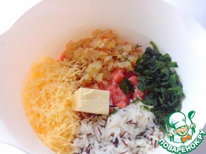 К куриному фаршу добавить: обжаренный лук, рис, зелень (у меня замороженная петрушка), сливочное масло, мелко натертый сыр и порубленный чеснок. Посолить и поперчить по вкусу. Перемешать руками.
