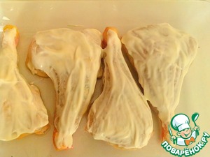 В процессе запекания будет выделяться сок. Этим соком, во время жарки, нужно будет пару раз полить куриные ножки.
