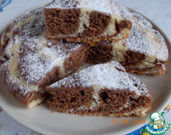 Поочерёдно (я по 3 ст. л.) наливать тесто в форму, в центр, чередуя белое и коричневое тесто.