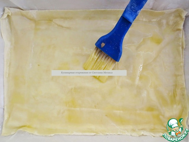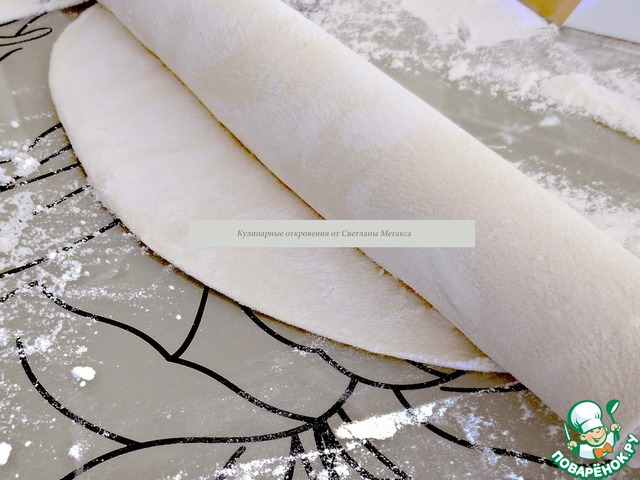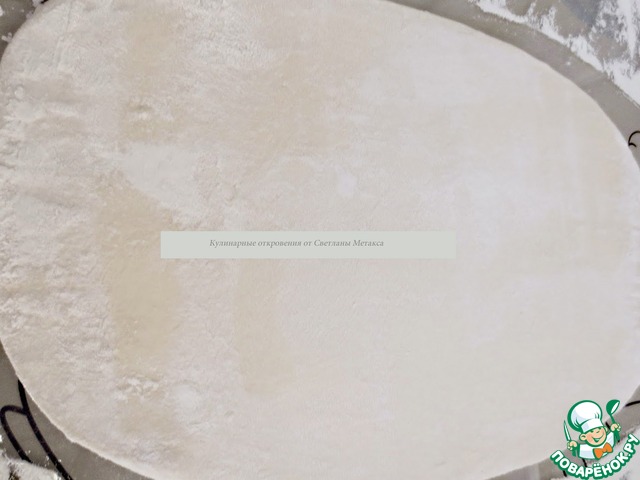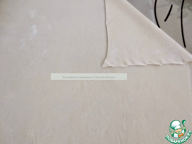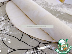 Раскрываем пласт на рабочую поверхность и вновь раскатываем почти до прозрачного состояния. Кисточкой сметаем лишнюю муку.