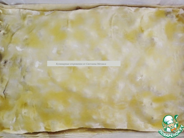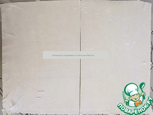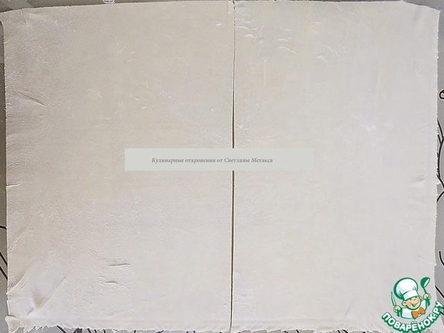 Разрезаем лист на 2 одинаковые, прямоугольные части. Из 3-х частей теста у нас получается 6 листов.