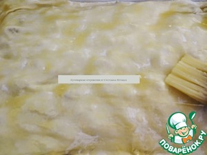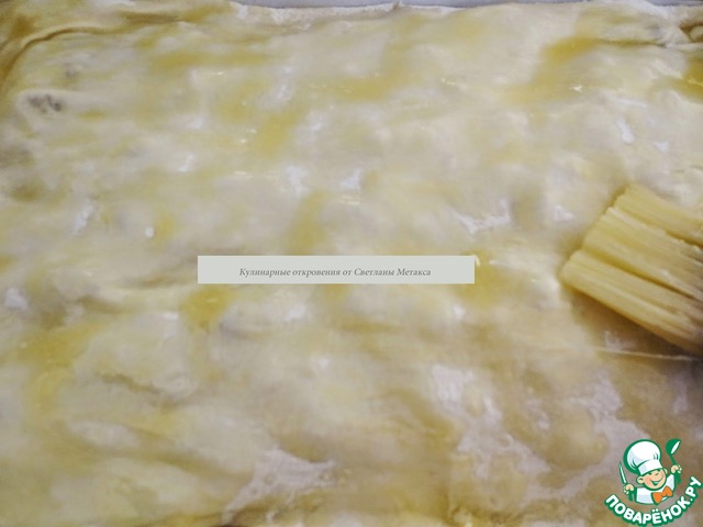 Накрываем пятым листом, смазываем его маслом, накрываем шестым листом, поверхность которого смазываем взбитым желтком