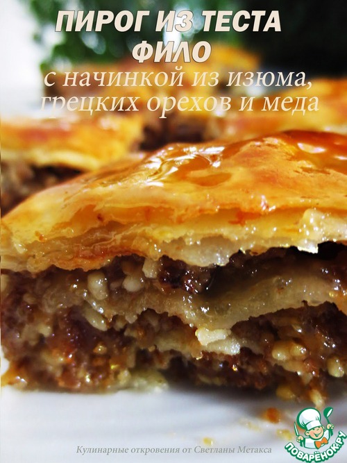 Пирог из домашнего теста фило с начинкой из грецких орехов, изюма и меда. Часто мне задают вопрос, где купить тесто фило и что это такое? Тесто фило - это почти невесомое тесто, которое готовится с небольшим добавлением воды и масла, без яиц. Слои перед запеканием смазываются маслом. Технология приготовления теста фило была придумана греками. Тесто раскатывается до толщины листа, отсюда и произошло название этого теста. ФИЛО в переводе с греческого означает лист. Тесто пресное, вытяжное и очень тонкое. Широко используется не только в греческой кухне, но и в кухне многих народов мира: турецкой, албанской, венгерской и так далее. Это тесто не часто встречается в продаже во многих регионах России, поэтому я решила поделиться одним из рецептов его приготовления в домашних условиях. Сегодня я приготовила пирог очень похожий на греческую пахлаву. Начинка не совсем классическая, а также имеются отклонения от рецепта настоящей греческой пахлавы, поэтому я и назвала свой пирог "ПОЧТИ ПАХЛАВА"