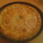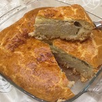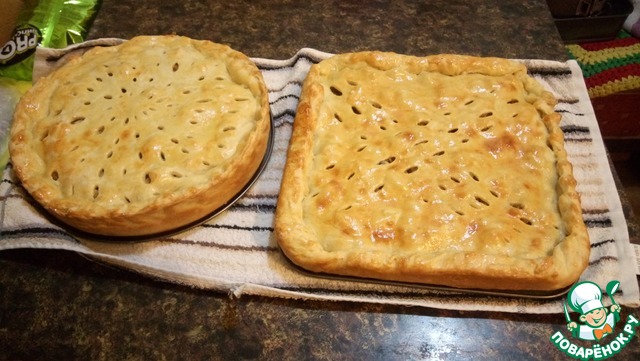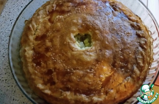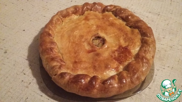 Раскатать второй кусочек теста, накрыть им начинку, соединить края теста и защипнуть. Взбить оставшийся белок и смазать их верх пирога. В центре сделать отверстие, чтобы пар из начинки мог свободно выходить. Выпекать 45-50 минут до золотистого цвета. Расстегнуть форму, снять кольцо, поставить пирог на решетку и накрыть кухонным полотенцем. Дать «отдохнуть» 10 минут. Подавать горячим с бульоном.