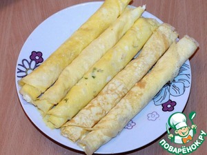 • Из тертых сырков, выдавленного чеснока и майонеза сделать кремообразную смесь и смазать блинчики.