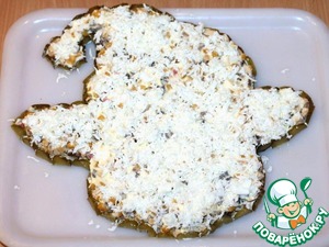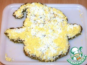 • Смазываем немного майонезом и посыпаем тертым на мелкой терке белком.