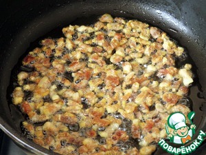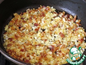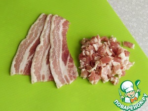 Бекон обжариваем на сковороде до золотистых, но мягких шкварок.