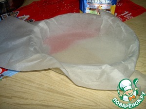 Далее я беру овальную стеклянную форму и застилаю её пекарской бумагой.