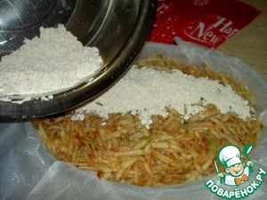 Затем нужно насыпать большую часть сухой смеси на дно формы и разровнять, не утрамбовывая. И сверху распределить наши натёртые фрукты (Вместе с соком!)