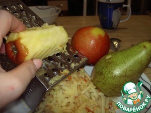 Сначала я натираю на крупной тёрке 2 больших яблока и крупную грушу, желательно сладких сортов, т. к. это позволяет мне уменьшить до минимума кол-во сахара (фруктозы)