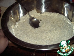 Затем смешиваю в миске все сухие компоненты. Муку обязательно просеиваю с целью обогащения кислородом. Это обязательно нужно делать! Если учесть то, что в муке иногда попадаются посторонние включения.