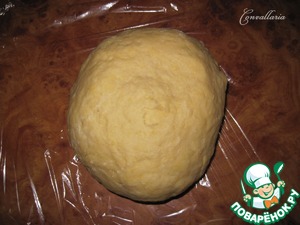 Из творога, мягкого сливочного масла, куриного яйца, просеянной муки и соли замесить песочное тесто. Завернуть его в пищевую пленку и убрать в холодильник на 1 час.
