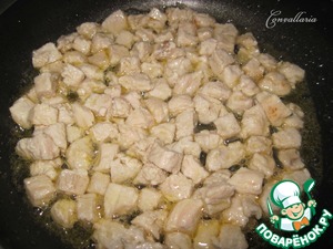 Филе индейки вымыть, обсушить и нарезать небольшими кусочками.