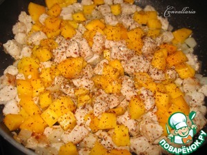 К филе добавить рубленный репчатый лук и тыкву, нарезанную маленькими кубиками.