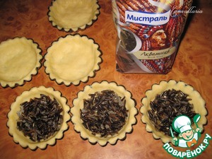 Тесто разделить на 6 одинаковых частей, выложить в формы для тарталеток, сформировав бортики. На дно тарталеток положить по 1 ч. л. риса. -