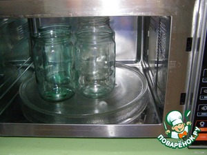 Банки помыть и простерилизовать. Я для этого использую микроволновку. Влажные банки ставлю и включаю на стандартный режим авторазогрев на 1,5 минуты.