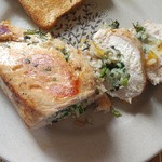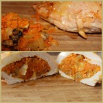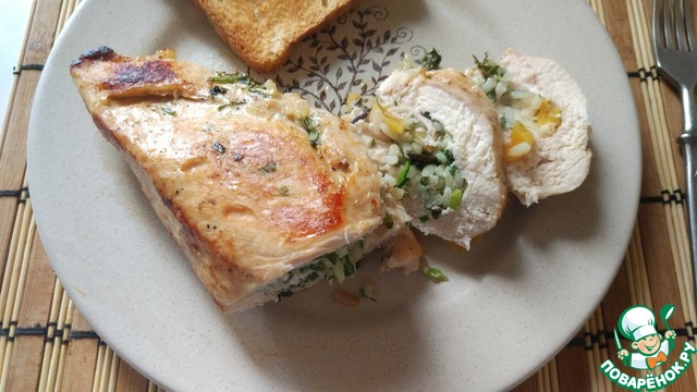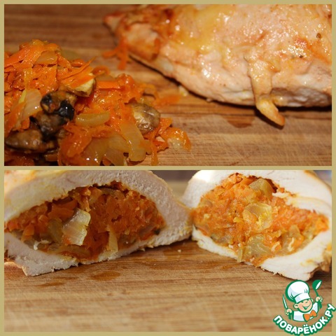 В куриных грудках сделайте нарезы поперёк. У вас получатся мясные мешочки. Заложите в разрезы начинку и сколите палочками.