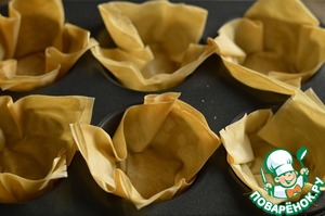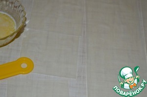 Тесто фило разморозить. Духовку разогреть до 180С. Тесто нарезать небольшими квадратами. 25г сливочного масла растопить. Квадрат смазать маслом, сверху выложить второй.