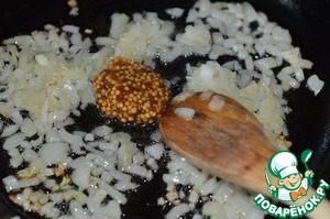 В сковороде разогреть оставшееся масло. Лук нарезать кубиком, обжарить до прозрачности. Добавить горчицу, перемешать.