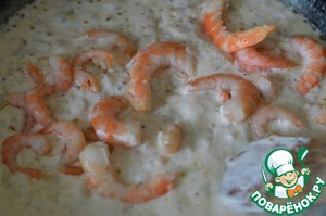 Муку смешать с паприкой и каенским перцем, добавить в сковороду и хорошо перемешивая, жарить минуту. Затем влить вино, тушить пару минут. Затем влить сливки, перемешать, уменьшить огонь до минимума и готовить пару минут. Затем добавить креветки. тушить еще 3 минуты и снять с огня.