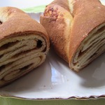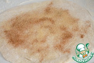 Раскатываем еще две части и посыпаем корицей и коричневым сахаром. Сворачиваем в два рулета. Швы тщательно защипываем.
