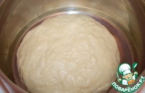 Соединяем опару с яйцами и сливочным маслом. Перемешиваем. В просеянную муку добавляем ванилин и постепенно вводим в смесь. Замешиваем тесто, мешаем не долго, мукой не забиваем. Для удобства руки смазываем растительным маслом. Оставляем для поднятия на 1, 5 часа.