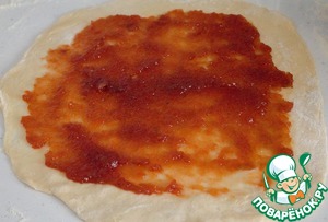 После чего тесто делим на 4 части. Раскатываем две части в круг. Смазываем яблочным повидлом тонким слоем. Сворачиваем в два рулета. Швы тщательно защипываем. Начинки кладем не много.
