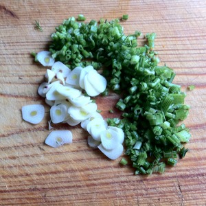 Чеснок режем тонкими пластинками. Стебли укропа и листья мелко рубим по-отдельности.