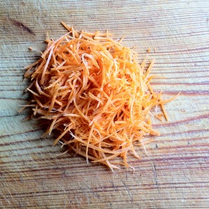На растительном масле обжарим морковь, стебли укропа и чеснок около двух минут.