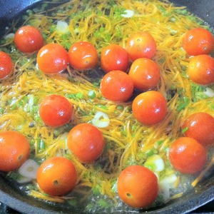 Добавляем помидоры черри и вино. Доводим до кипения и тушим на тихом огне примерно 15 минут.