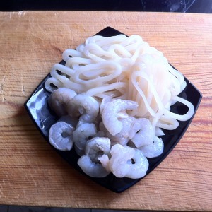 Пока тушатся овощи, нарежем тушки кальмаров кольцами. Креветки у меня уже очищенные, без вены.