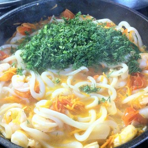 Через три минуты добавляем кольца кальмаров и нарубленную зелень укропа. Солим и перчим. Доводим до кипения, выключаем и даём постоять под крышкой пару минут.