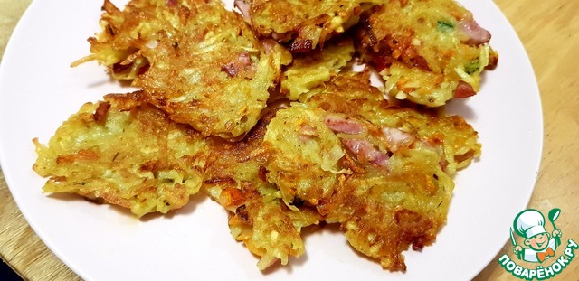 Оригинальные оладушки с колбасой, картофелем и морковью.