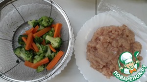 Морковь и брокколи бланшировать несколько минут в кипящей воде. Вынуть и дать стечь лишней жидкости.
