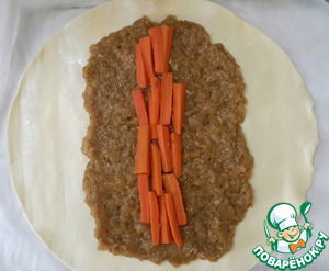 Разложить (оно у меня свернуто рулончиком) пласт готового, размороженного слоеного теста. Я обычно с вечера перекладываю тесто из морозилки в холодильник и утром оно готово к работе. На тесто положить фарш ровным слоем, недоходя до краев. Сверху фарша положить слой бланшированных кусочков моркови.