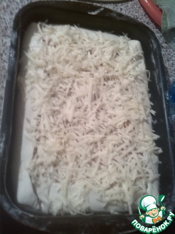 Выкладываем начинку и посыпаем тертым сыром и ставим в духовку на 30-40минут. выпекать при температуре 180 градусов.