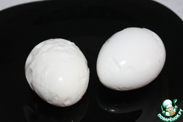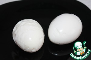 Яйца отварить всмятку, после закипания 4 мин. Обдать холодной водой и аккуратно очистить.