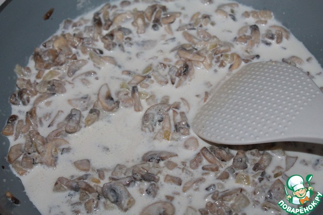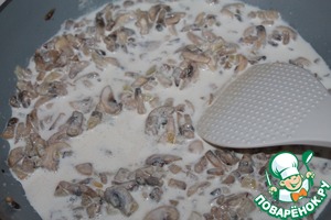 К шампиньонам добавляем обжаренную муку и быстро перемешиваем. Вливаем сливки и непрерывно мешаем, пока сливки не закипят. Сразу же снимаем с огня.