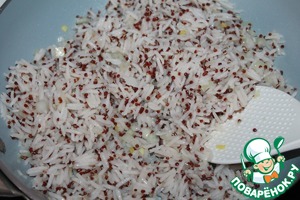 Добавляем к луку рис Басмати Quinoa Mix ТМ Мистраль. Держим на огне 1 - 2 минуты.