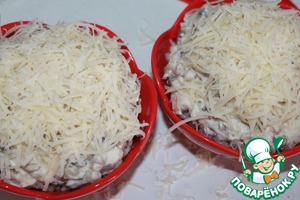 Посыпаем натертым пармезаном. Отправляем в разогретую до 200 град. духовку на 5 мин. до того, как сыр расплавится. Корочка нам не нужна. Посыпаем зеленью.