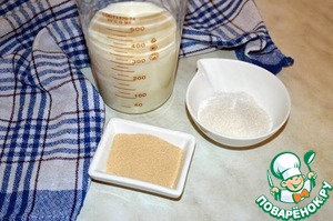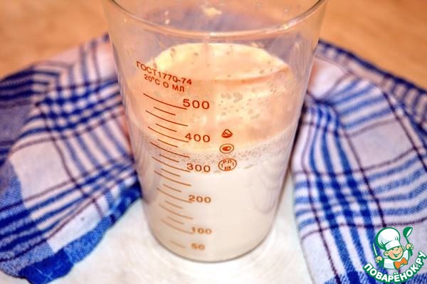 Мы должны получить вот такую пенную "шапочку" на молоке! У нас сейчас в квартире прохладно, потому я ставлю чашку с опарой в кастрюльку с теплой водой и процесс идет активнее!