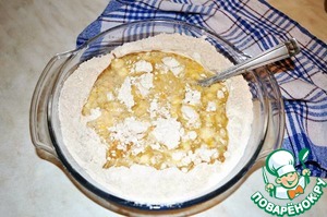 В опару наливаем растительное масло и яйца (предварительно взболтать вилкой), хорошо перемешиваем и вливаем в воронку из муки.