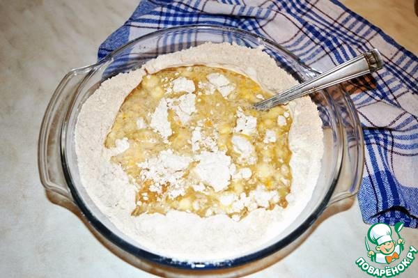 В мисочку просеем два вида муки (но можно готовить только на пшеничной муке!!!). Яйца и растительное масло оставим при комнатной температуре, чтобы они не были холодными при добавлении в тесто.