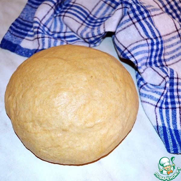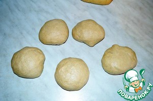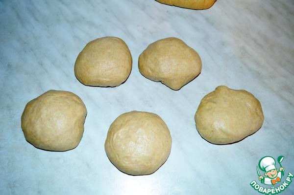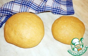 Подошедшее тесто хорошо обминаем и делам на две неравные части.