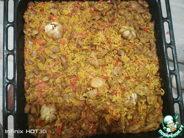 Накрываем всё это фольгой и отправляем в разогретую до 190-200 градусов духовку на 50-60 мин. До готовности риса. Когда будете проверять готовность, фольгу приоткрывайте ложкой или другим прибором с ручкой, т. к. оттуда будет идти горячий пар.