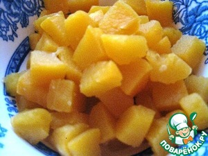 Нарезанную кубиками тыкву бланшируем в кипящей воде (отвариваем 1 минуту), выкладываем на сухую тарелку.
