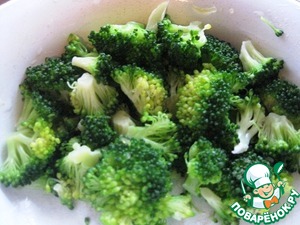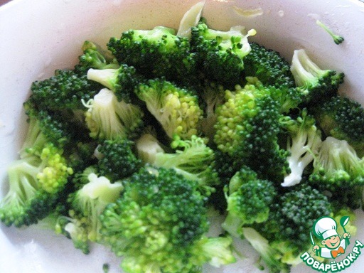 Разобранную на соцветия брокколи бланшируем в той же воде. Перекладываем в ледяную воду на 1 минуту. Выкладываем на сухую тарелку.