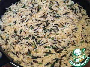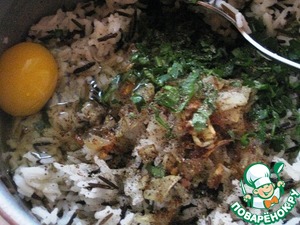 Теперь, когда весь стол заставлен тарелками с нашими продуктами, начинаем их освобождать. К сваренному рису добавить соль, перец, лук обжаренный, петрушку, яйцо. Перемешать